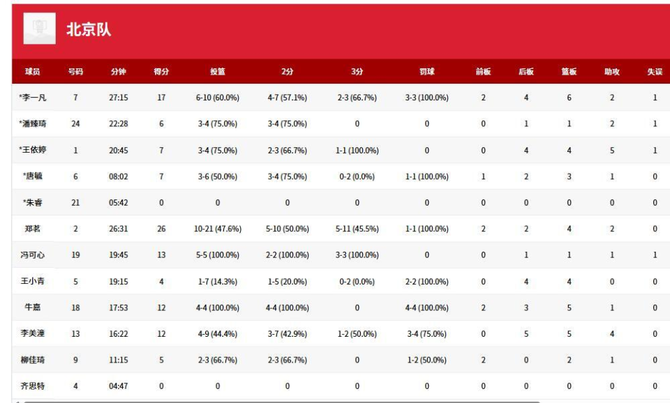 北京队阵容配置优势显著,拥有现役国手潘臻琦、李一凡及前国手唐毓等主力球员。其中郑茗表现尤为突出,贡献全场最高的26分并摘下4个篮板。潘臻琦完成回归俱乐部后的首秀,取得6分2助攻的数据。年轻球员李一凡展现出色状态,得到17分6篮板的全面数据。