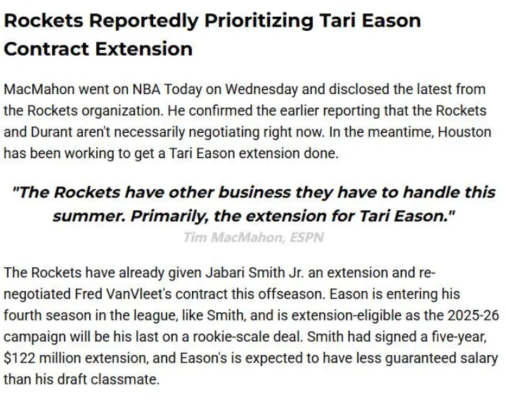 HB火博体育蒂姆-麦克马洪说道:火箭未必正在跟杜兰特谈续约,但休斯顿一直都在极力促成与塔里-伊森的提前续约。火箭队今夏余下最重要的事务是提前续约伊森,因为伊森的提前续约需要在10月26日前完成,而杜兰特的续约可以推迟到明夏6月30日。